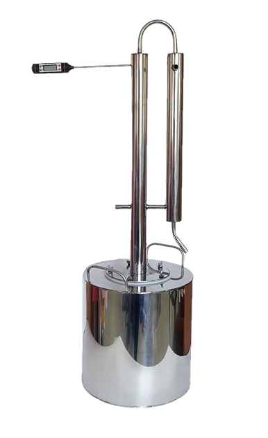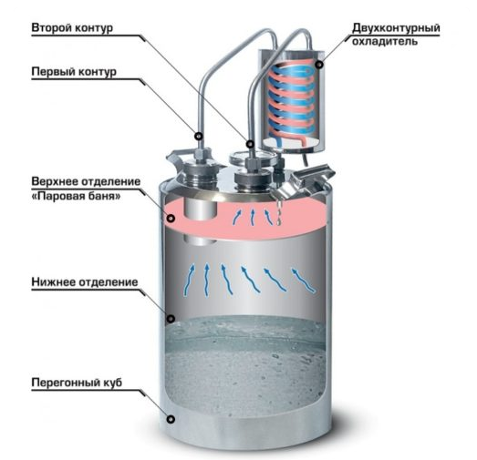 Особенность конструкции состоит в том, что самогонный аппарат состоит из двух камер. После нагревания браги в основной камере - спиртовые пары поднимаясь по первому контуру аппарата, проходят охладитель, и далее конденсируются в верхней (второй) камере. Там они нагреваются до испарения, а дальше происходит такой же процесс конденсации с прохождением через охладитель.